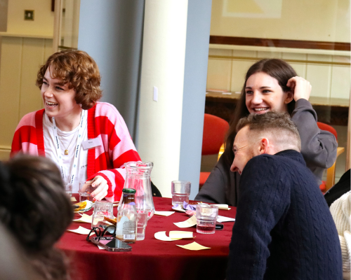A photograph of people sitting at tables at a meeting event, they are looking away from the camera and towards a speaker who is not in view.